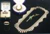 a 9ct three-colour gold fringe necklace, a 9ct gold mounted gem set ring, a bar brooch and a cameo brooch (5)