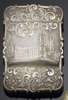 with marks for Birmingham 1845?, maker Nathaniel Mills, of shaped rectangular outline, the front cast with a view of York Cathedral amidst foliate scrolls, the reverse profusely decorated with foliate scrolls around the central shaped oval cartouche inscribed Mrs E.S. Livingston, contained in a fitted case, together with an engine turned card case, Birmingham 1868, initialled within a fastened belt motif, cased (2)