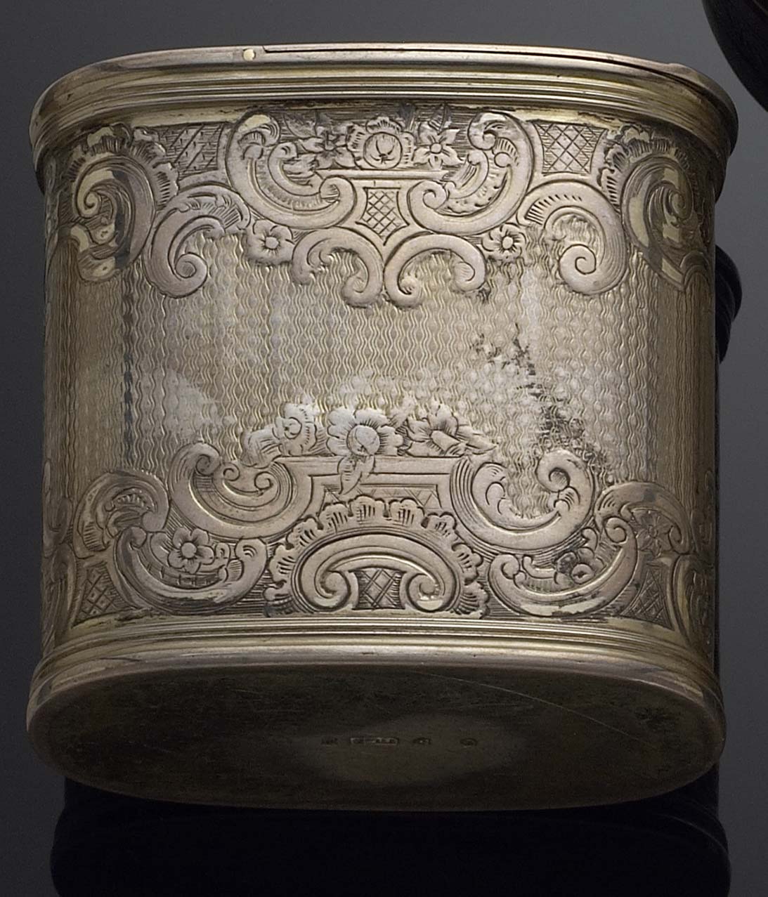with marks for Edinburgh 1848, maker DC Rait of Glasgow, of gilded engine turned oval form, with flat hinged cover and shaped thumb-piece, decorated with borders of C-scrolls, fruit, foliage and diaper panels