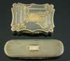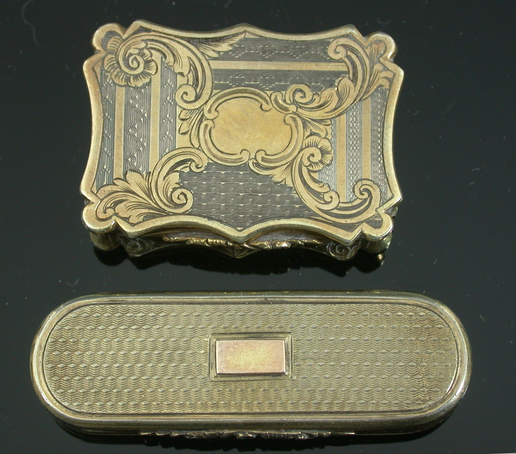 with marks for Birmingham 1835, maker Nathaniel Mills, of engine turned oval form, with central vacant rectangular plaque and foliate carved thumb-piece to the cover, with gilt foliate scroll pierced grille and sponge, together with a shaped rectangular parcel gilt vinaigrette, Birmingham 1847, also by Nathaniel Mills, foliate scroll engraved and decorated with assorted engine turned panels, with foliate carved thumb-piece and gilt foliate scroll pierced and engraved grille (2)