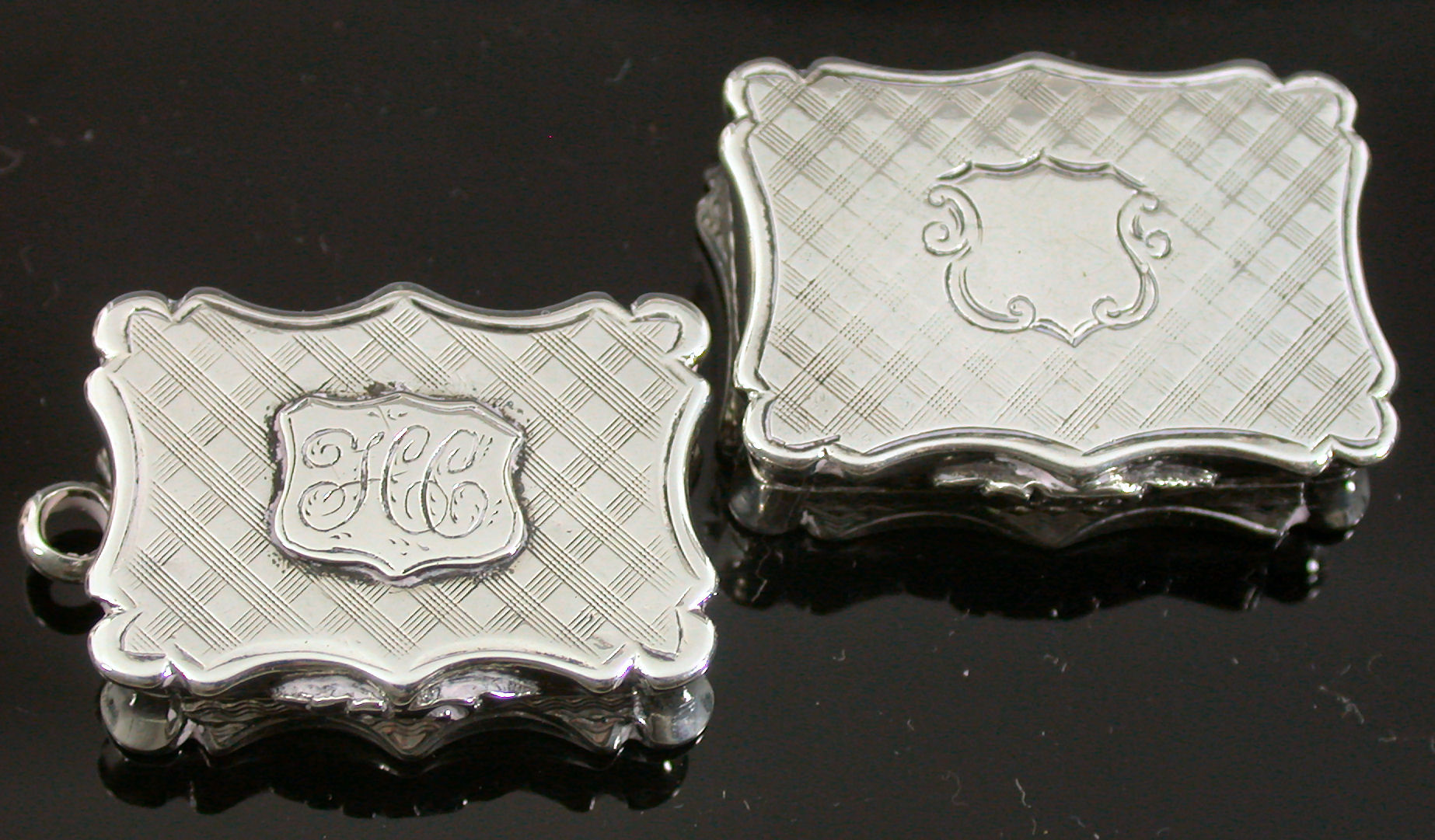 with marks for Birmingham 1843, maker Nathaniel Mills, of shaped rectangular form, tartan pattern engraved with scroll thumb-piece and foliate scroll pierced grille, initialled, together with another similar vinaigrette, Birmingham 1842, same maker (2)
