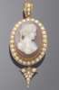 the central oval cameo carved to depict a female portrait profile within a surround of half-pearls, with graduated half-pearl set bale and similarly set tapered drop
