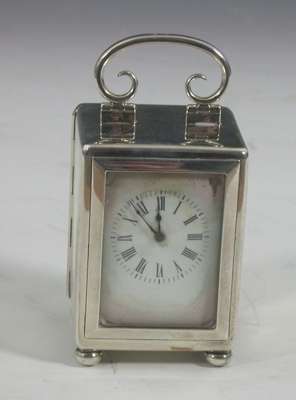 with marks for London 1899, by William Comyns, with plain case and folding scroll handle, on bun feet, engraved with a monogram, the white enamel dial with roman chapters