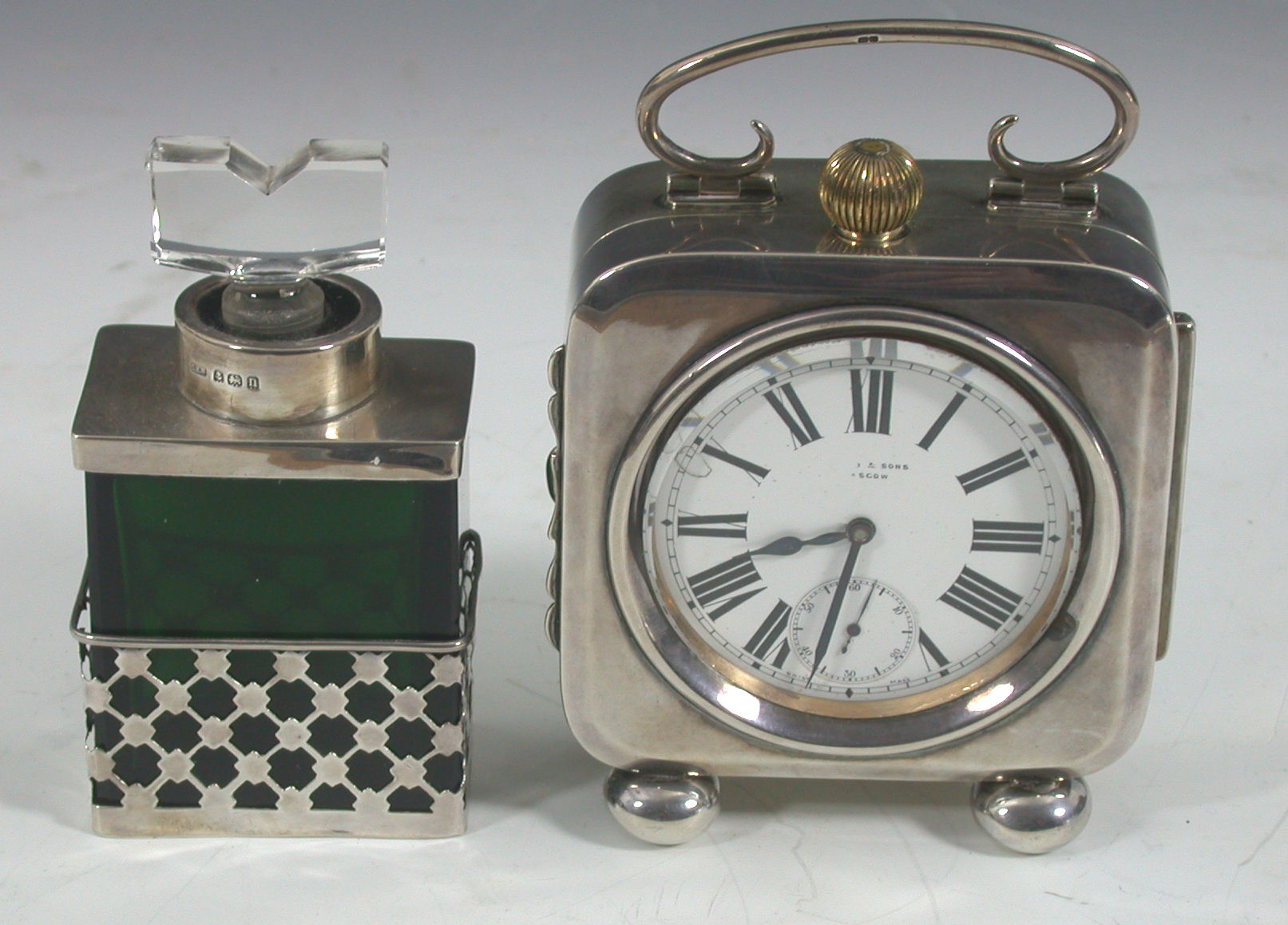 with marks for Birmingham 1903, maker Deakin & Francis, of rounded square form, with C-scroll handle, on four bun feet, containing an electroplated goliath pocket watch, together with a mounted green glass scent bottle, Birmingham 1912, of rectangular outline with diaper pierced mounts and clear glass stopper (2)