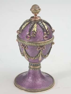 of ovoid form on pedestal foot, decorated all-over with purple guilloche enamel overlaid with two-colour gold bow-tied ribbons, foliate swags and bead borders, collet set with circular cabochon cut rubies and graduated rose cut diamonds, the pull-off stopper with high domed circular cabochon cut colourless stone