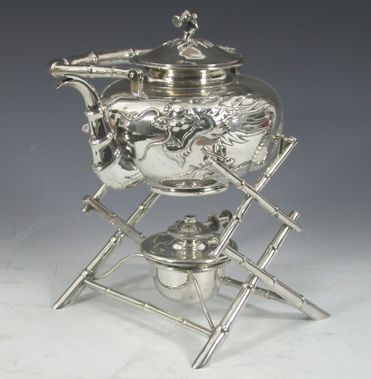 of circular outline cast with a dragon with bamboo cast finial to the domed cover and similarly cast swing handle, spout and stand