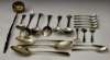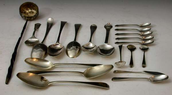with marks for London 1679, maker's mark rubbed, a pair of Rat Tail pattern table spoons, London 1728, initialled, a pair of Old English tablespoons, London 1788, also initialled, and other pieces to include a whalebone handled ladle and a preserve spoon by Alexander Ritchie (qty)