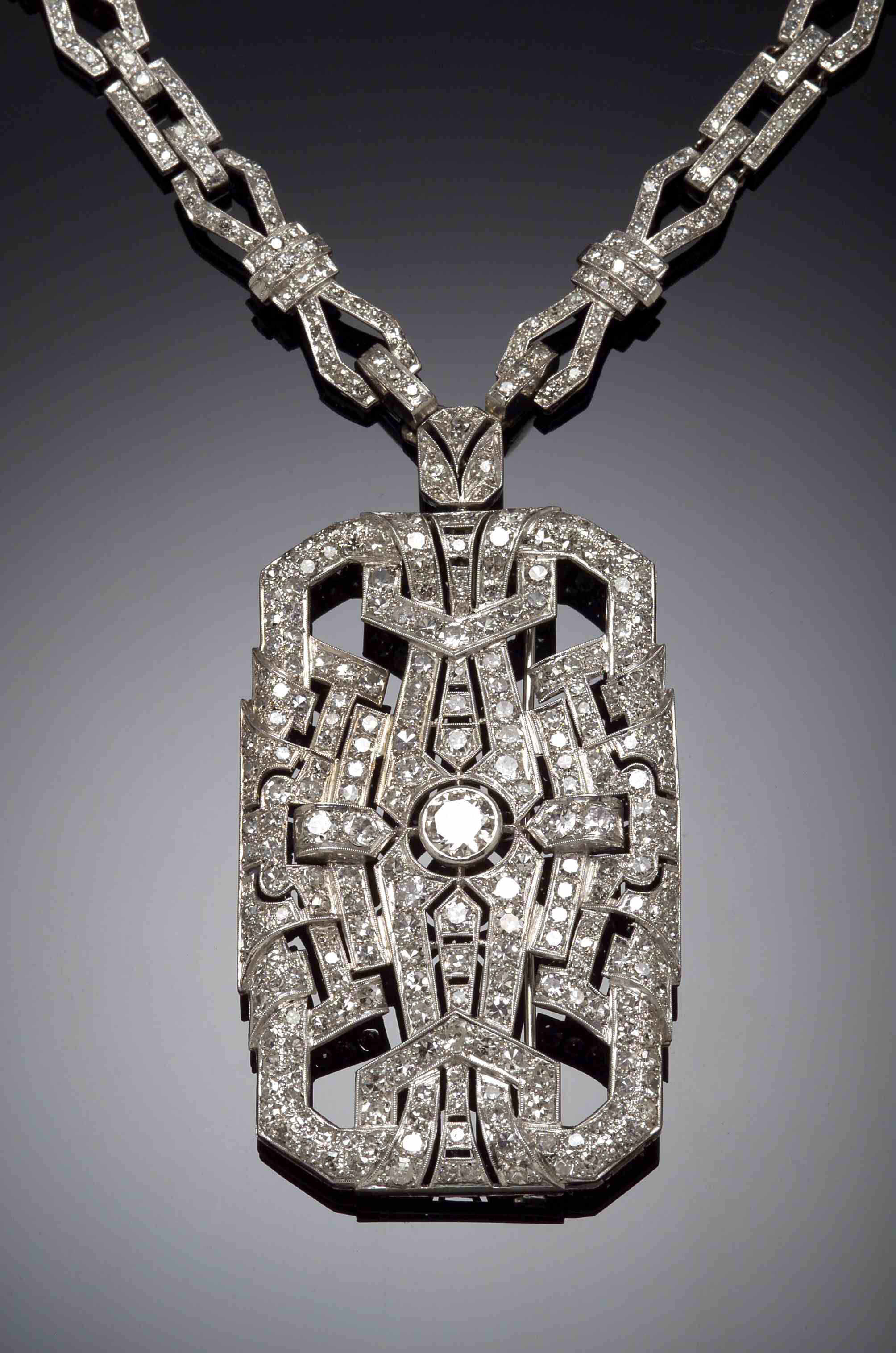 This wonderful sautoir, which splits to form four separate diamond bracelets and a plaque brooch, is so evocative of the Art Deco period and is a good illustration of the geometric motifs found not only in the jewellery of that time, but in house furnishings, art works, architecture and clothing.
