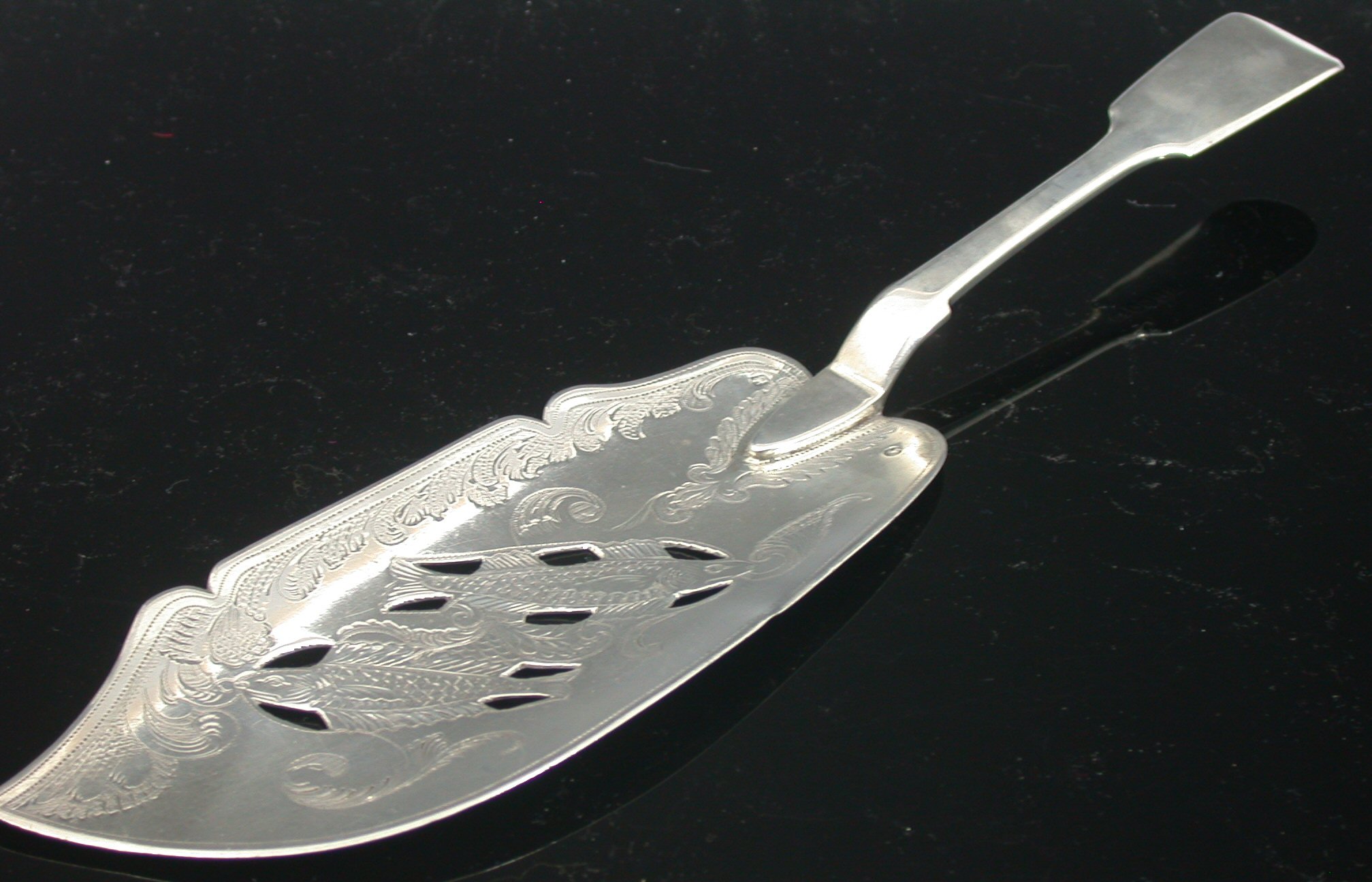 with marks for Dublin 1844, maker unidentified (see Jackson's p. 655), of Fiddle pattern, with shaped and pierced blade engraved with fish and scrolling foliage