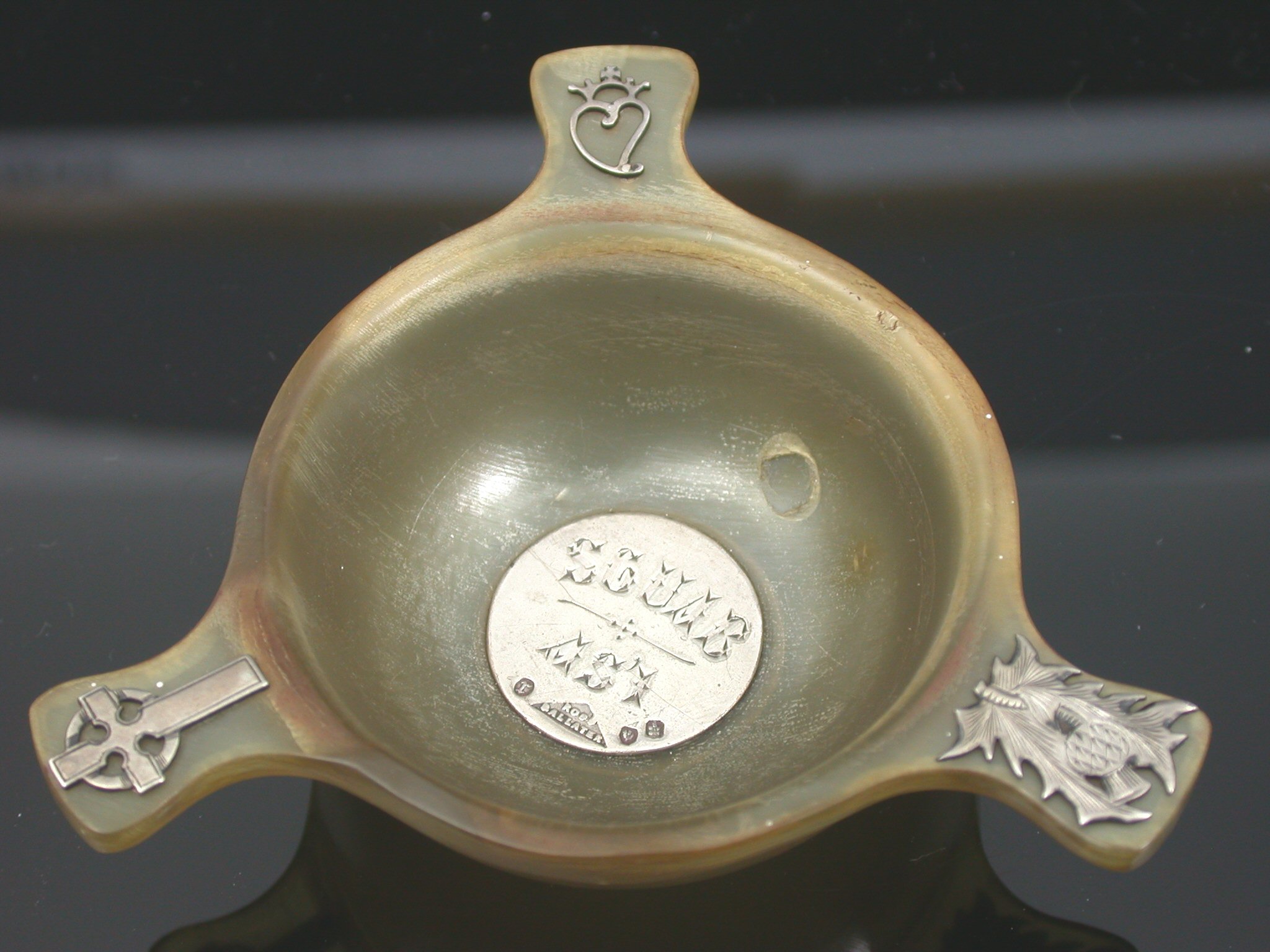 with marks for Edinburgh 1898, maker Robb of Ballater in triangular mark, with four marks, the quaich of three lugged form with Scottish emblems applied to each lug Luckenbooth, thistle and Iona cross, the central boss engraved SGUAB AS'I
