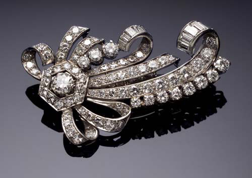 designed as a stylised bow-tied ribbon, set throughout with round brilliant, single and baguette cut diamonds, the central claw set round brilliant cut diamond within an octagonal surround