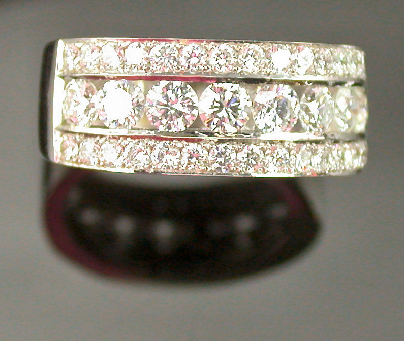 the central channel set row of round brilliant cut diamonds flanked above and below by borders of smaller similarly cut diamonds