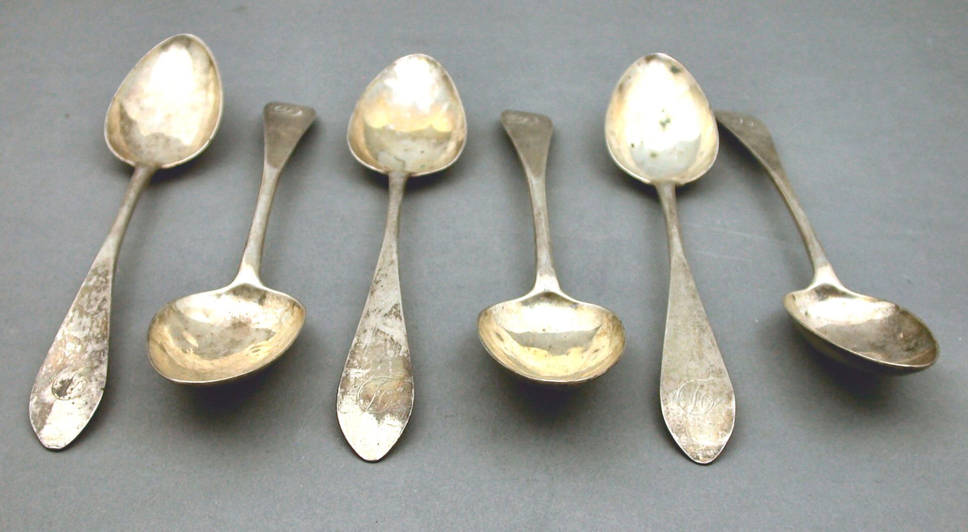with marks for Greenock circa 1800, marked C, ship, anchor and tree, no maker's mark, of Celtic Point pattern, with engraved initial D in script