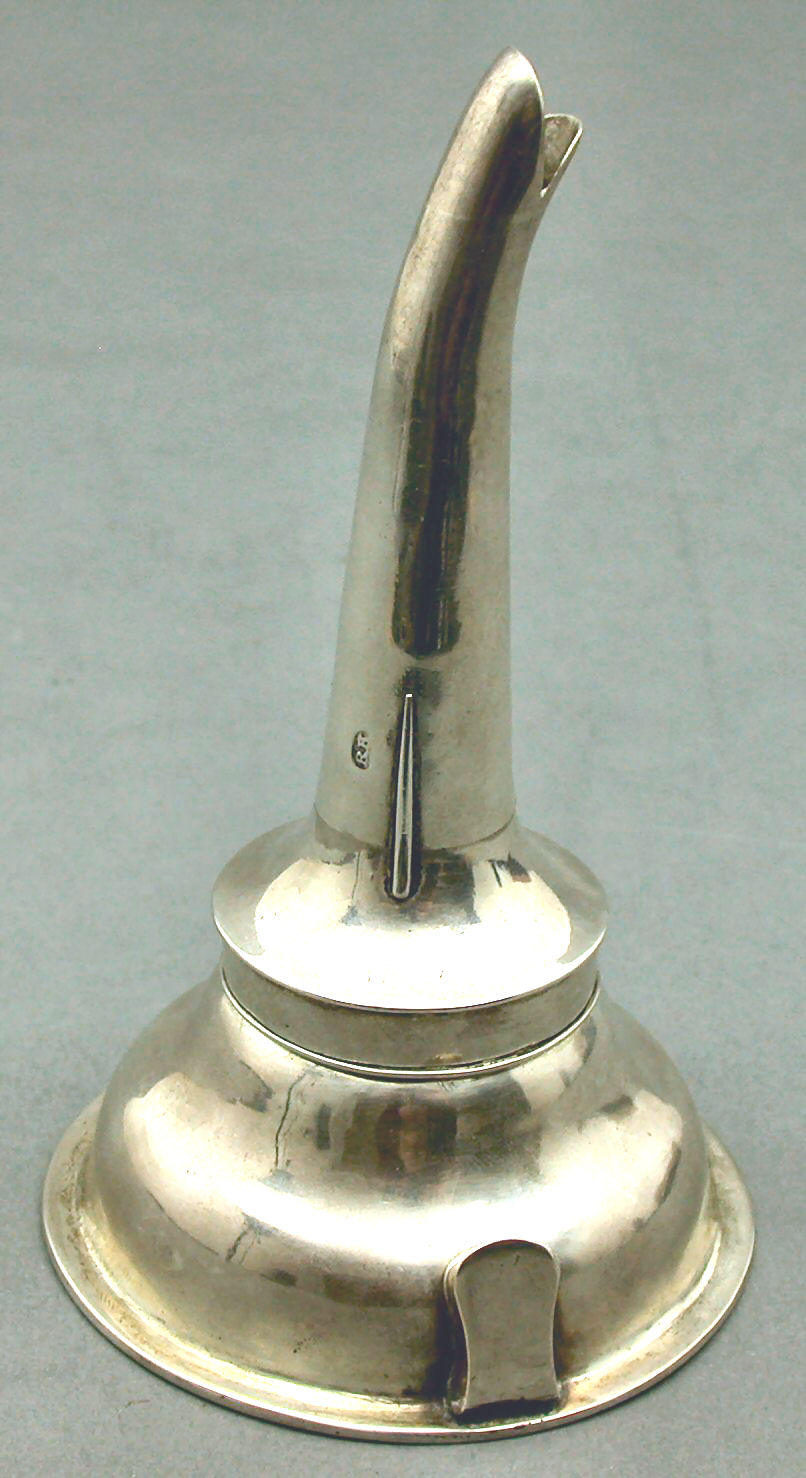 with marks for Perth circa 1800, maker Robert Keay I, marked to bowl RK, double-headed eagle and RK, spout also marked RK, with three applied staves to spout, plain waisted thumb piece and muslin ring