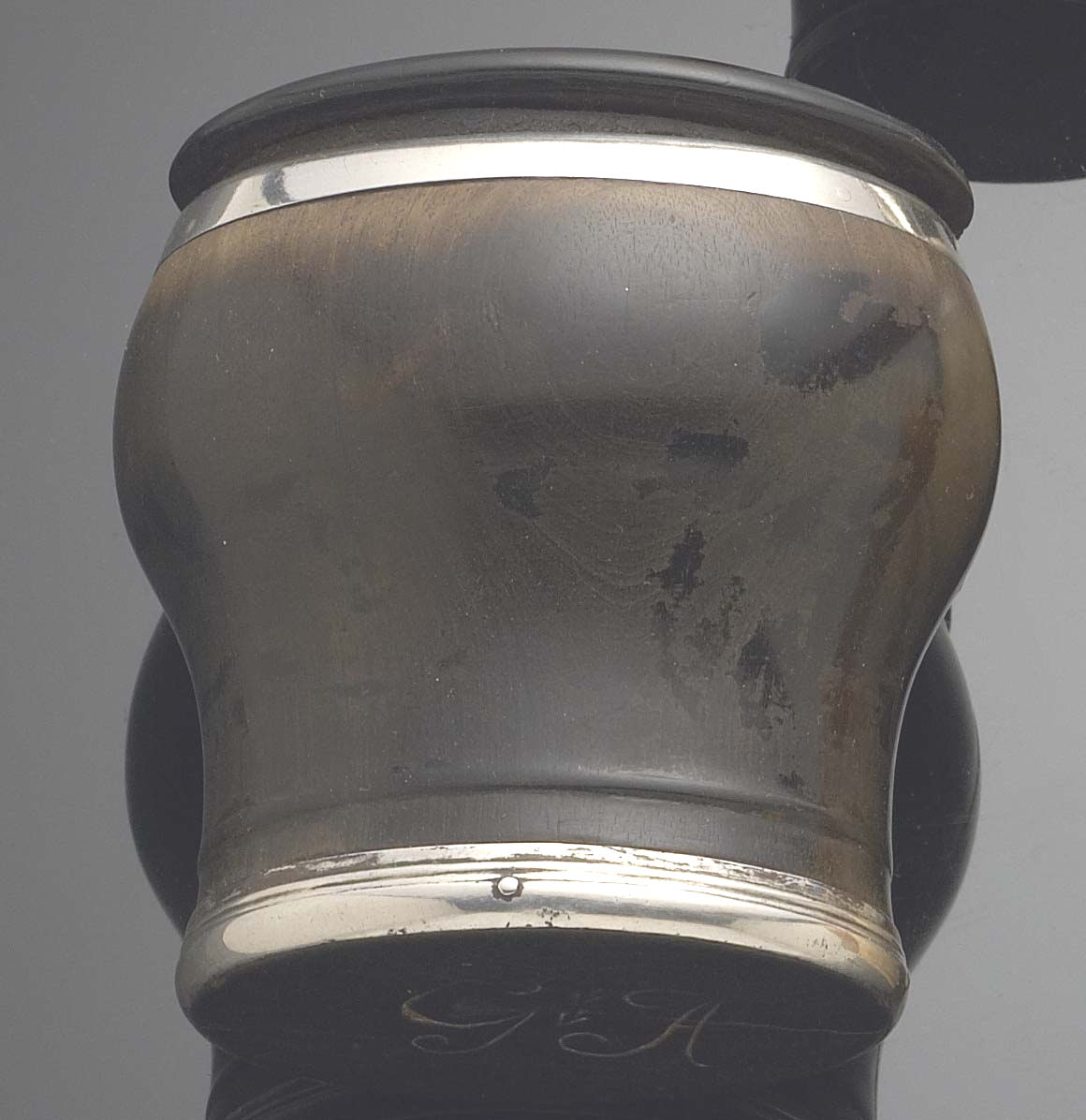 mounts apparently unmarked, of baluster form, with butterfly shaped hinge and applied oval plaque to lid, engraved Stark Love & Kindness above Rob Gibb with central clasped hands, carved to base GA