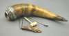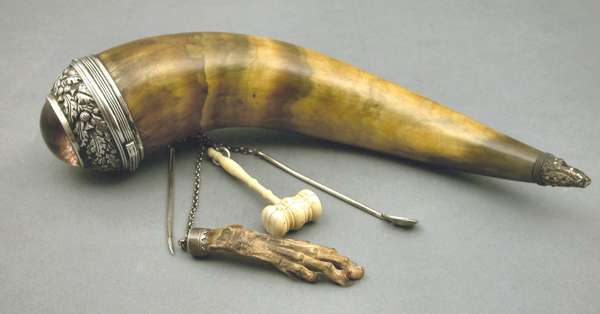 apparently unmarked, the hinged domed cover with thistle and foliate cast border around the central high domed circular quartz cabochon, with similarly mounted terminal, with four tools including an ivory mallet, pierced spoon, pick and animal foot suspended from belcher link chains