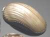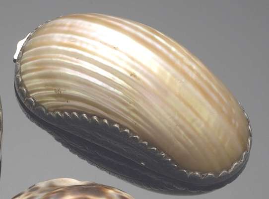 stamped with three indistinct marks to flat hinged cover, the ridged domed iridescent shell with bright engraved mounts, with scalloped edge to sides and spiral border to cover, also with shaped thumb piece, initialled JL in script