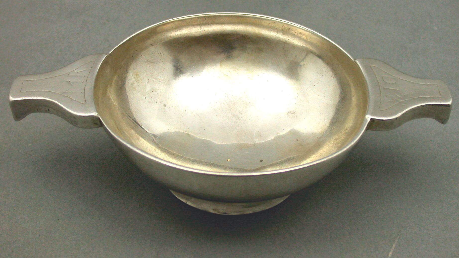 with conjoined maker's mark only to underside indistinctly struck within in a square punch, the plain circular bowl with shaped lug handles, engraved with initials DMK and MR