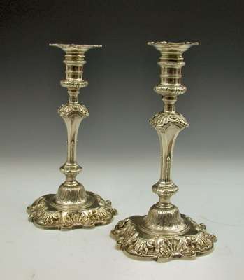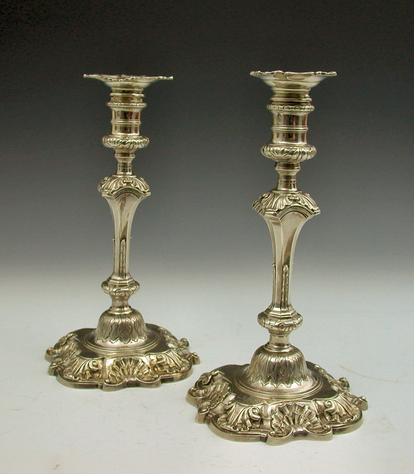 with marks for Dublin circa 1760, maker Robt Calderwood, the shaped square bases with shell and scroll cast borders, beneath tapered octagonal cloumns and vase shaped capitals decorated with stiff leaf borders, the shaped square sconces with shell corners, crested