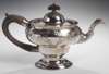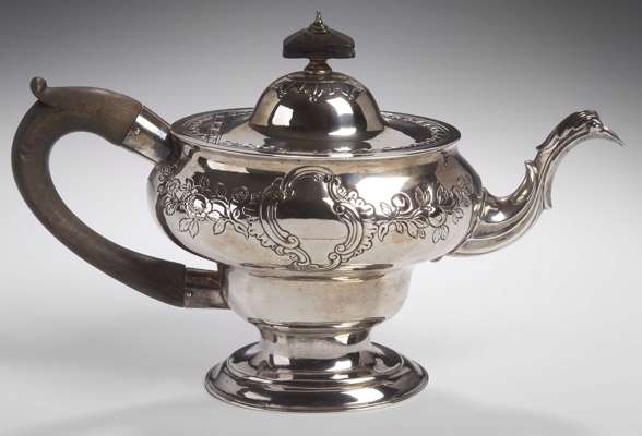 with marks for Edinburgh 1770, maker Wm Dempster, of inverted baluster form on domed foot, with foliate capped spout and fruit and floral engraved border with central vacant cartouche, with domed flat hinged cover