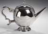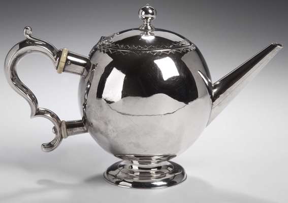 with marks for Edinburgh 1729, maker Wm Aytoun, assay master Edward Penman, the plain spherical body, on domed circular foot, with ball finial to the domed cover, straight spout and muscular scroll handle, with diaper and fringed chevron engraved border where the cover meets the body and decorative scroll hinge