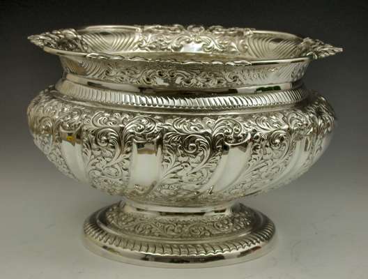 with marks for Sheffield 1900, maker's mark HA, of cushioned circular form, with foliate scroll cast everted rim and similarly decorated sides with central vacant cartouches, on circular foot with gadrooned border