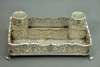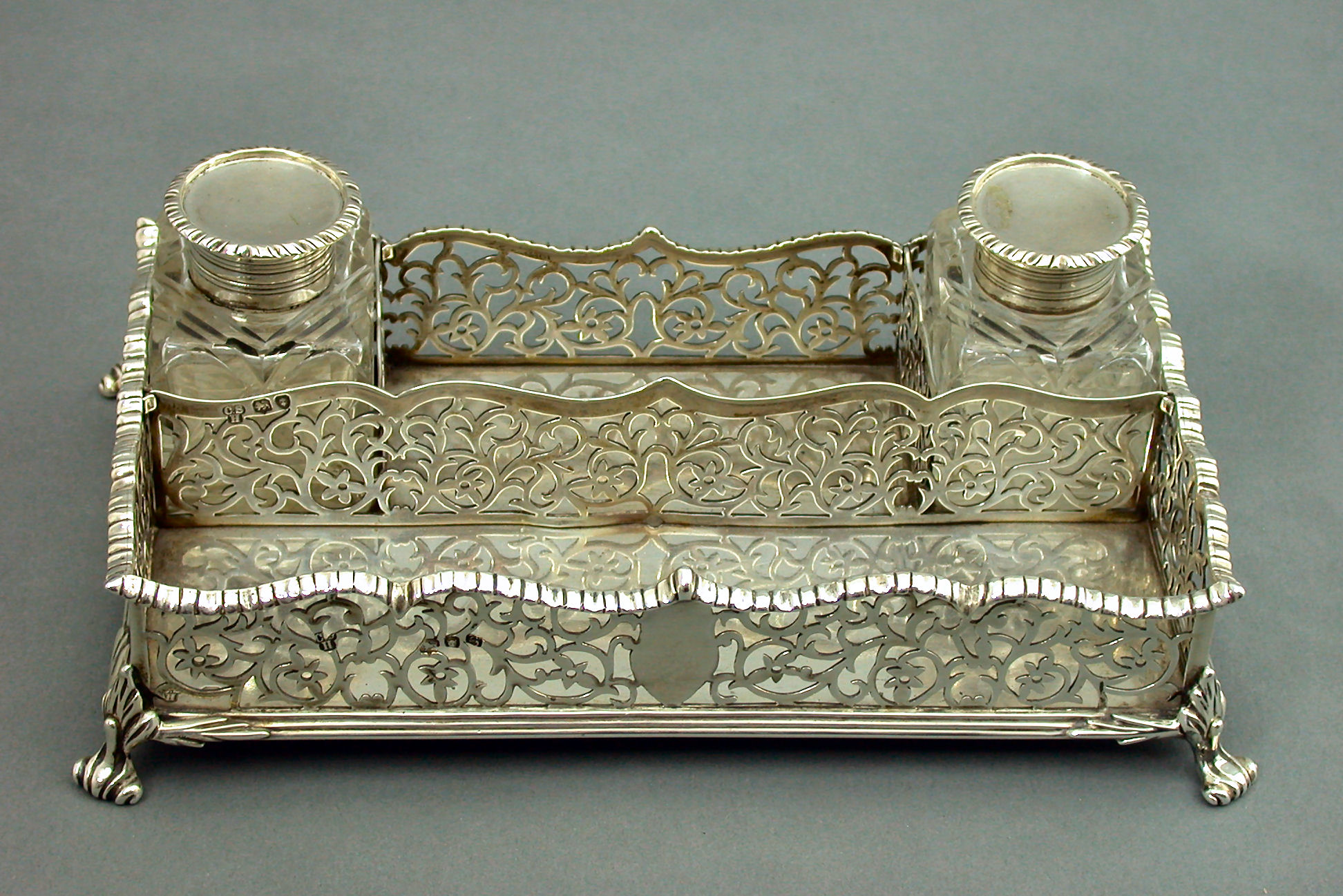 with marks for London 1893, maker Charles Stuart Harris, of shaped rectangular outline, with gadrooned edge, and scroll pierced sides, raised on four foliate capped scroll feet, fitted with two mounted cut glass ink bottles