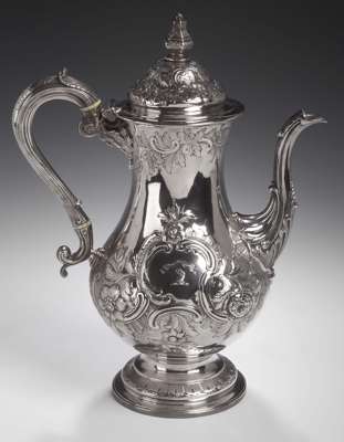with marks for London 1842, maker's mark IW, of foliate scroll cast baluater form, on pedestal foot, with leaf capped S-scrolol handle and faceted finial to the domed cover