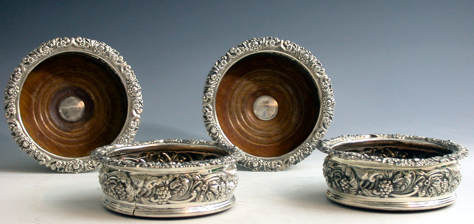 with marks for Sheffield 1818, by SC Younge & Co, each richly chased and embossed with fruiting vines with everted scroll and foliate decorated border, with turned wooden base and central initialled disc (4)