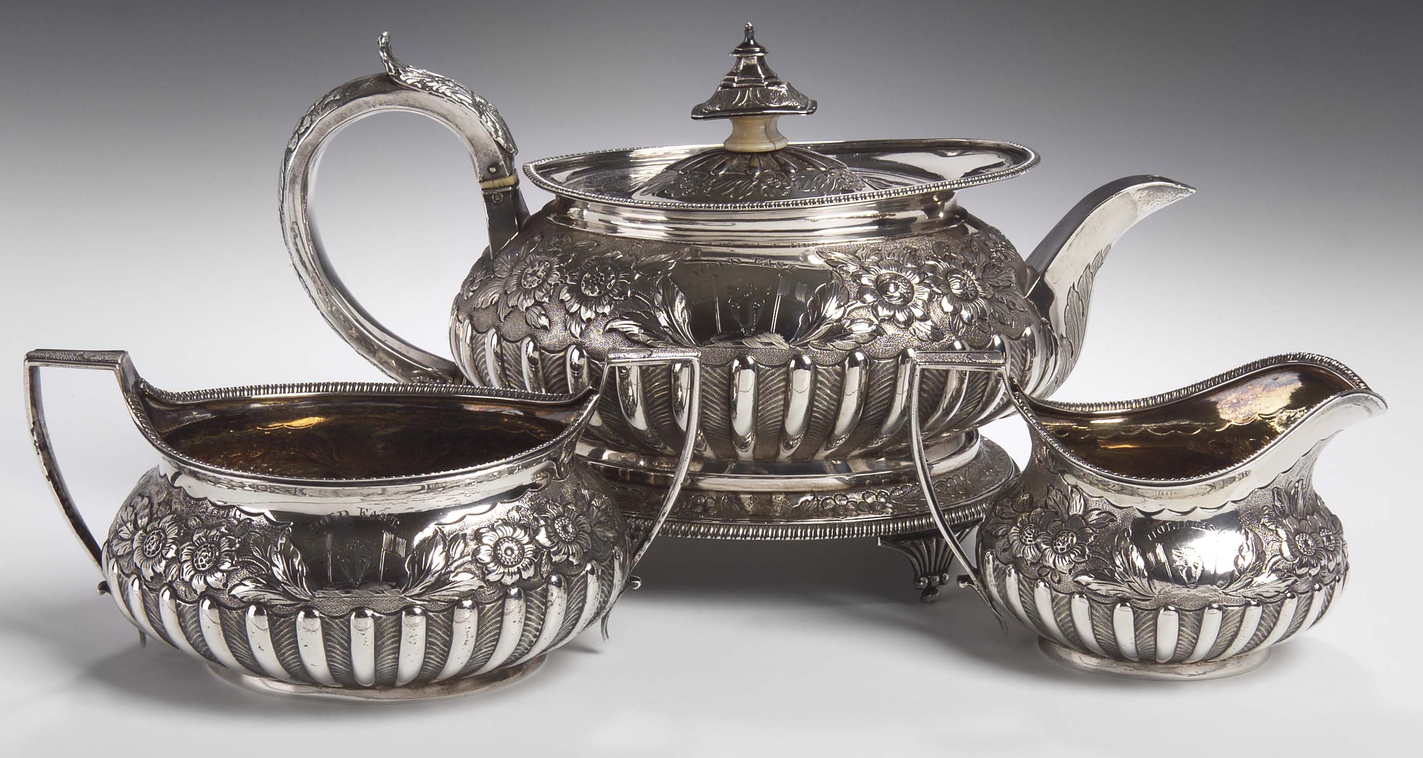 with marks for London 1803, maker HN, comprising teapot with stand, twin handled sugar bowl and cream jug, each of semi-fluted oval outline, with cast floral border against a stippled ground and gadrooned edges, crested and inscribed HOLD FAST