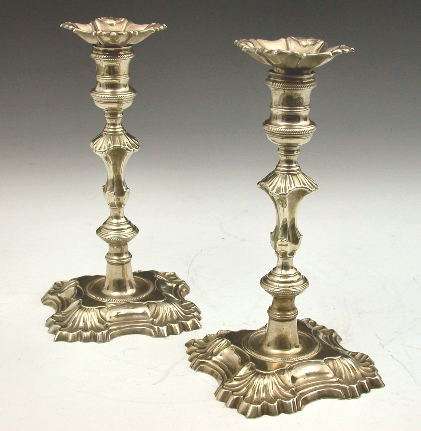 with marks for London 1753, maker James Gould, the shaped square bases with shell cast corners and gadrooned borders, beneath knopped columns and waisted capitals also with gadrooned borders, the shaped square sconces with matching shell cast corners, unmarked