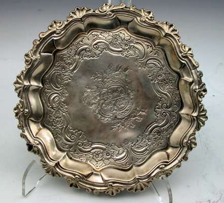 with marks for London 1751, maker WI?, of shaped circular form with shell and scroll cast edge, pie-crust moulded and foliate scroll engraved borders, with central engraved armorial, on three hoof feet, and another waiter, London 1776, by Robert Jones I and John Scofield, with bead and shell cast edge on three claw and ball feet (2)