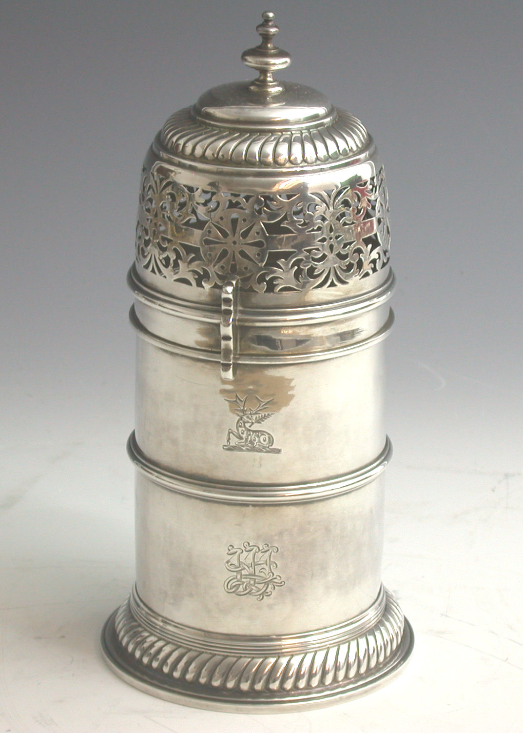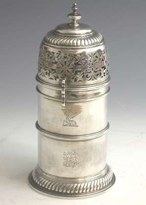 with marks for London 1727, maker's mark indistinct, of large size and lighthouse form, with gadrooned borders and foliate scroll pierced high domed cover, crested and monogrammed