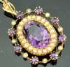 of oval form, the central oval cut amethyst within a surround of half-pearls and an outer border alternately set with seed pearls and amethysts, suspended from a fine curb link chain