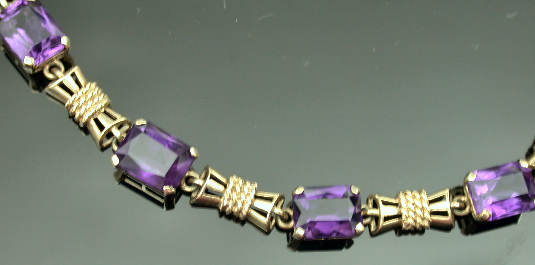 corner claw set with trap cut amethysts interspersed with fancy waisted links (mounts unmarked test as gold), contained in a fitted case