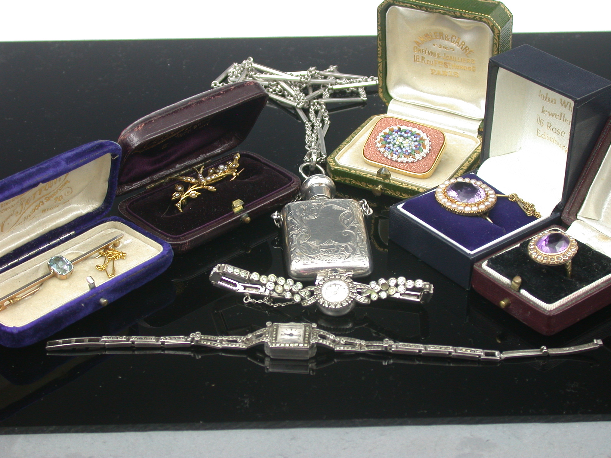 a similar oval brooch, a seed pearl set bar brooch, another set with an aquamarine, a mosaic brooch, two lady's wristwatches, and a foliate engraved silver scent bottle with fancy link chain (qty)