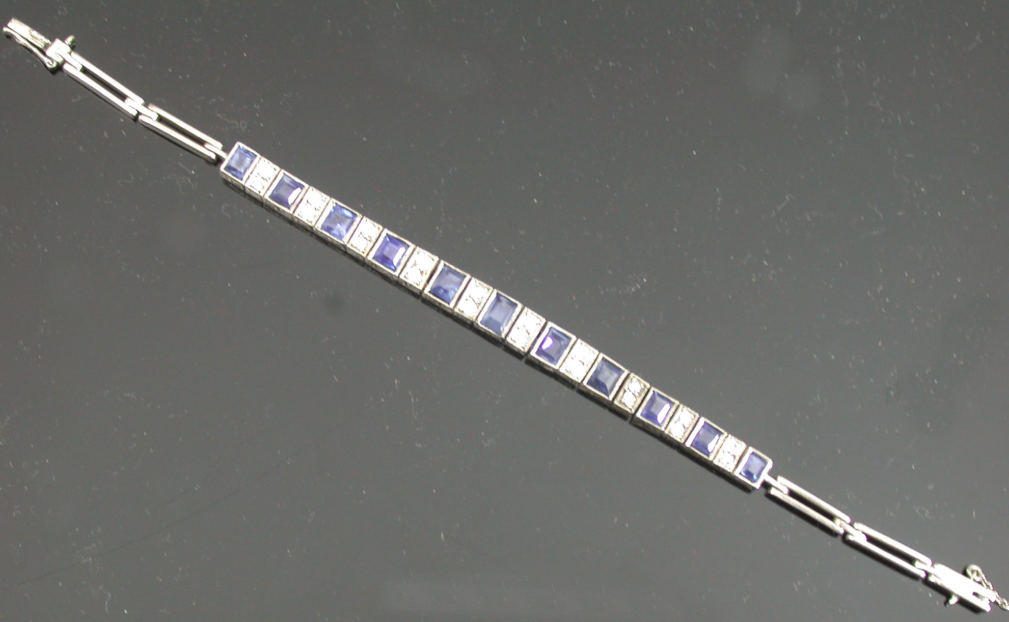 box set to the front with slightly graduated rectangular cut sapphires, with pairs of round brilliant cut diamonds between, with foliate engraved sides