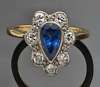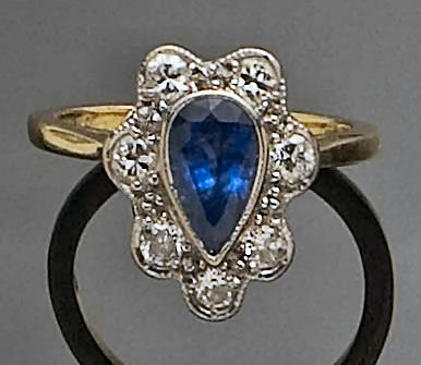 millegrain collet set to the centre with a pear cut sapphire within a shaped oval surround set with seven round brilliant cut diamonds