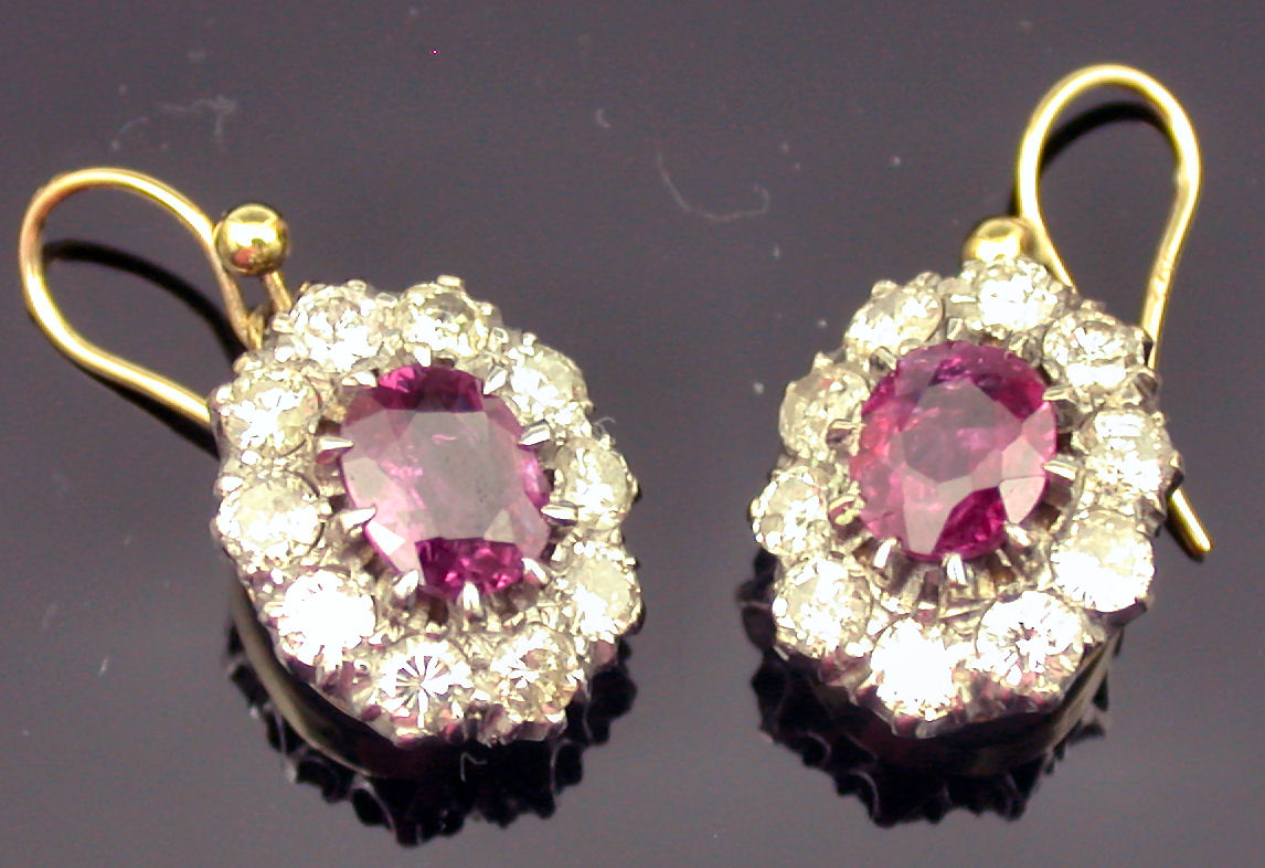 each designed as an oval cluster with central oval cut ruby within a surround of round brilliant cut diamonds, with wire fittings
