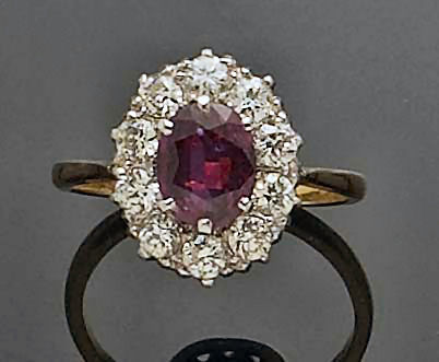 the central oval cut ruby within a surround of round brilliant cut diamonds