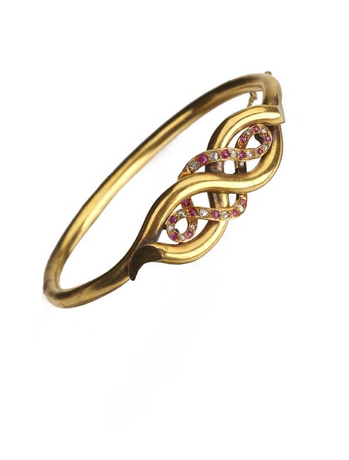 of hinged design with entwined figure-of-eight motif to front, alternately set with circular cut rubies and rose cut diamonds