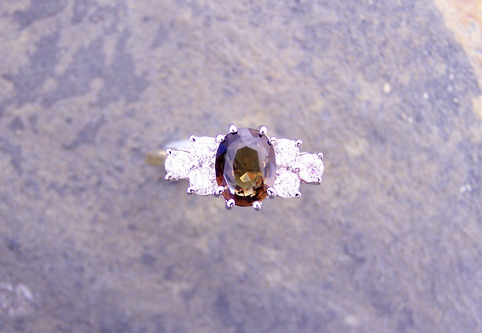 the central claw set oval cut alexandrite variously appearing reddish-brown and greenish-brown, flanked to either side by three similarly set round brilliant cut diamonds