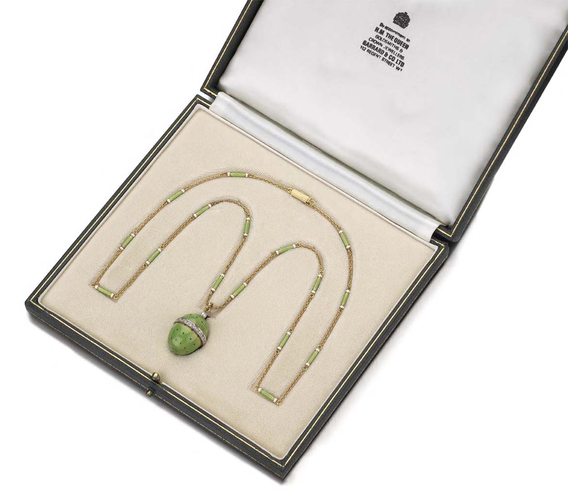with marks for London 1977, maker's mark M M, the pale green guilloche enamel decorated ovoid pendant applied with dots of black enamel, with single cut diamond set girdle, surmounted by a seed pearl, the whole suspended from a fine belcher link chain with matching white and pale green guilloche enamel decorated cylindrical spacers, additionally stamped 750 and indistinct maker's mark, contained in a fitted case stamped Garrard & Co. Ltd...