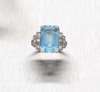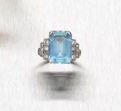 corner claw set with a large trap cut aquamarine, flanked by stepped shoulders set with graduated round brilliant and single cut diamonds