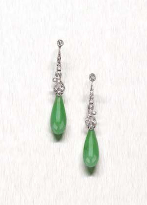 each composed of a tapered scroll millegrain set with graduated single cut diamonds, suspending an ovoid jade cabochon drop