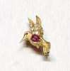 naturalistically modelled as a humming bird in flight, the body set with a large pear cut ruby cabochon, with smaller circular cut similar cabochon set eye and borders of graduated round brilliant cut diamonds to the outstretched wings