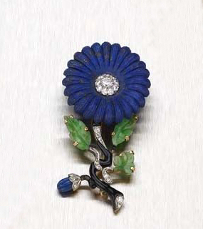 composed of a carved lapis lazuli flowerhead with central cluster of round brilliant cut diamonds, surmounting a black enamelled scrolling stem, set with graduated single cut diamonds, flanked by three foliate carved jade leaves and a carved lapis lazuli bud