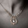 in the garland style, with central pearl drop within a floral and foliate wreath, surmounted by a bow-tied ribbon and flanked to either side by floral and foliate swags, set throughout with graduated old European cut diamonds