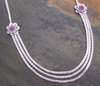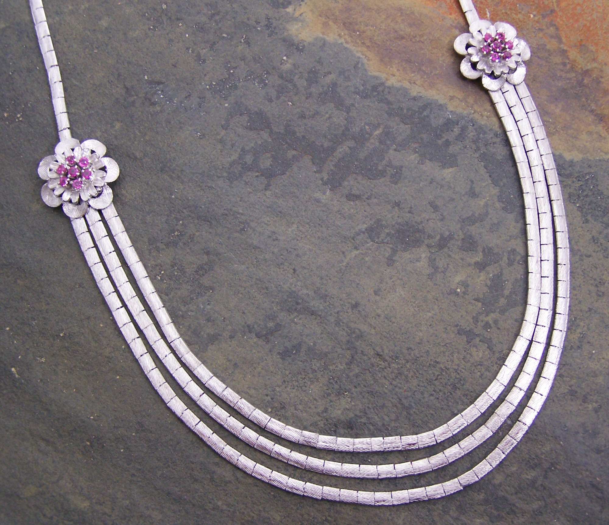 composed of flattened textured links, the front comprising three rows flanked by two floral medallions, each with central cluster of circular cut rubies, the clasp stamped 750
