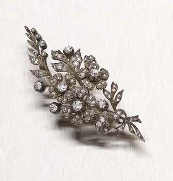 of naturalistic scroll design, with three central flowerheads, with detachable brooch fittings, contained in a fitted case